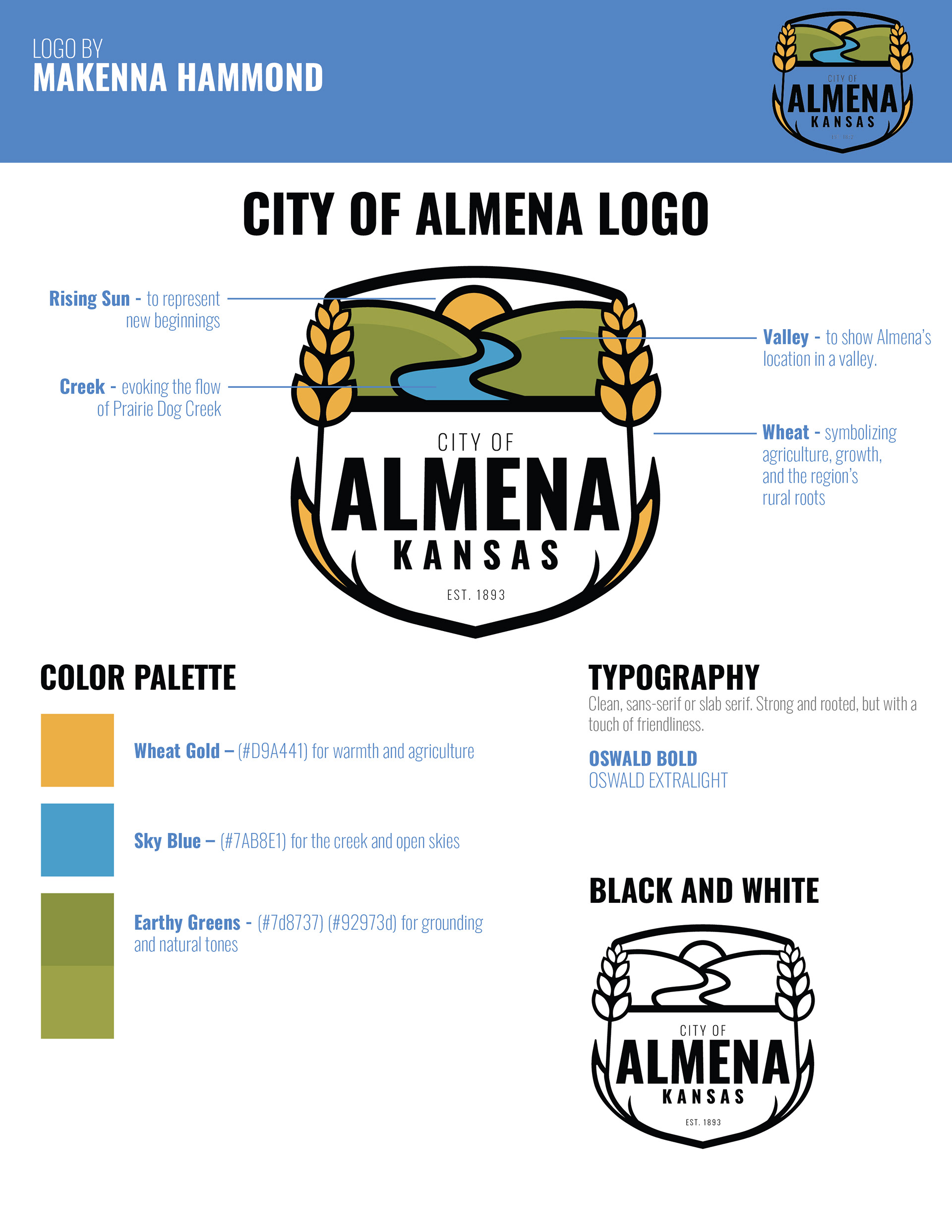The mark incorporates key local symbolism: wheat represents agriculture, growth, and the region’s rural roots; flowing elements reference Prairie Dog Creek; the valley shape reflects Almena’s geographic setting; and the rising sun symbolizes new beginnings and a hopeful future. Together, these elements tell a cohesive story about the city’s past, present, and forward momentum.